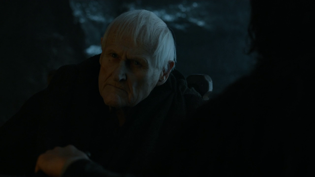 Segue to Castle Black, where Sam Tarly is reading the latest news of Daenerys to Maester Aemon, who is likely her last remaining relative–and dying. Jon Snow pops in to ask for Maester Aemon’s advice, which is to just “do it,” whatever it is. Half the men of the Night’s Watch already hate Jon, so he certainly can’t make things much worse for himself. “Kill the boy, and let the man be born,” Aemon intones.